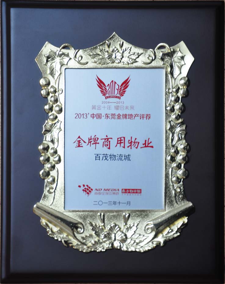 熱烈祝賀百茂物流城榮獲“2013東莞金牌地產(chǎn)專業(yè)市場”獎項
