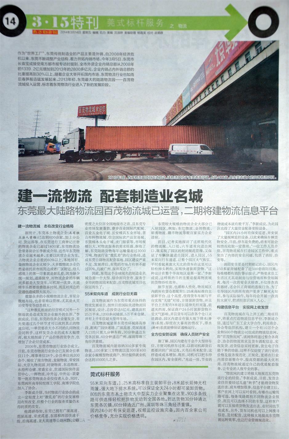 3月14日,在南方都市報東莞板塊的3·15特刊中,百茂物流城作為東莞物流行業(yè)龍頭企業(yè),成為莞式服務(wù)標(biāo)桿企業(yè)。