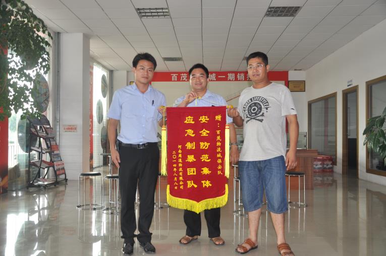 2014年8月11日上午,百茂物流城管理處一片喜慶熱烈的氛圍,園區(qū)商戶周通物流的老板周英杰攜妻女一同來(lái)到百茂物流城管理處,向百茂物流城保安隊(duì)送上了繡有“安全防范集體,應(yīng)急制暴團(tuán)隊(duì)”的錦旗。期間,周英杰不斷伸出大拇指稱贊百茂物流城為維護(hù)園區(qū)安全,控制突發(fā)性事件進(jìn)一步蔓延或擴(kuò)大所作出的貢獻(xiàn)。