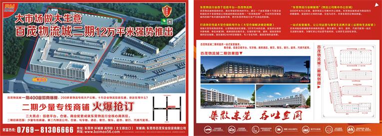 在廣告宣傳方面,百茂物流城已經(jīng)制作二期招商單張,在百茂物流城制作的內(nèi)刊《百茂快訊》開辟“招商專欄”,并在二期工地外墻的宣傳畫開展推廣工作,二期招商工作所需物料的準(zhǔn)備工作已基本完成。