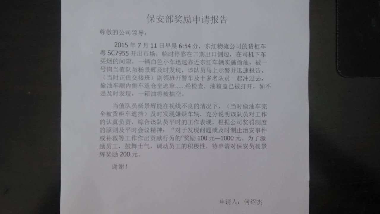 2015年7月11日早晨6:54分,東紅物流的貨柜車,臨時(shí)停放在二期出口側(cè)邊,在司機(jī)間歇之際,一輛小車??繙?zhǔn)備偷油時(shí),被百茂管理處保安部隊(duì)員及時(shí)發(fā)現(xiàn),馬上示警,迅速報(bào)告,當(dāng)值保安隊(duì)員立刻到位,偷油者倉皇逃竄,經(jīng)檢查,油箱蓋已被打開,保安隊(duì)員機(jī)警,迅速的處理方式,避免了商戶的財(cái)產(chǎn)損失,保安隊(duì)員楊景輝預(yù)予200元獎(jiǎng)金獎(jiǎng)勵(lì),以資鼓勵(lì),我們百茂管理處全體員工,致力于為廣大物流企業(yè)營造最安全,最和諧的的經(jīng)營環(huán)境,將不斷努力,不斷完善,讓您在百茂大市場,安心的做大生意!