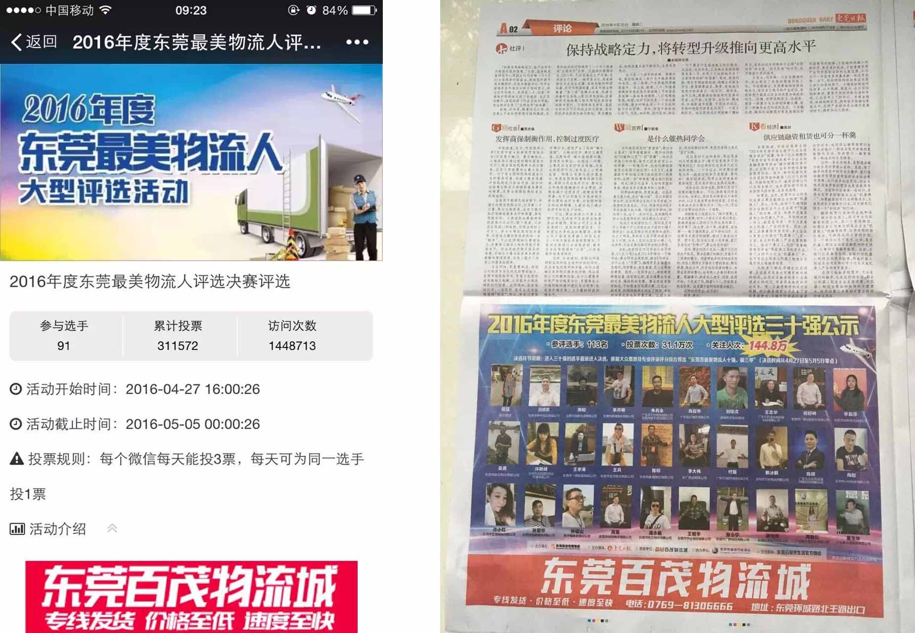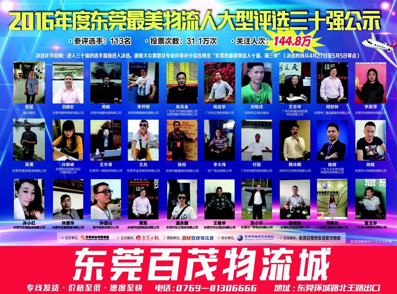 【最美物流人】無論您是否在第一輪比賽中進入前三十強,我謹代表主辦方對您表示由衷的感謝和贊賞,我們一起享受這個過程,我們同舟共濟,在144萬人次的關(guān)注支持下,我們贏了!今天的東莞日報A02版半版廣告已經(jīng)公布前三十強名單,看著轟動霸氣的版面,自豪感爆棚!物流人是如此的光彩照人,恭喜您!讓我們再接再厲,一起迎接明天的決賽里程,前十強爭霸賽,于明天27日下午四時正式啟動,讓我們再掀起新一輪高潮吧,加油,物流之驕子!你們太棒了!