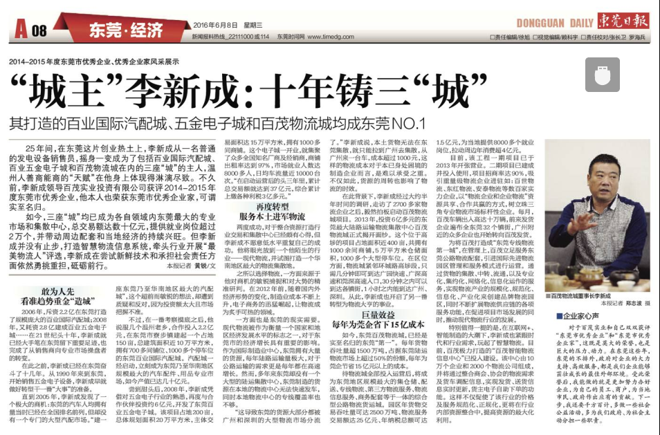 近日,東莞市百茂實業(yè)投資有限公司和百茂物流城董事長李新成雙雙獲評2014-2015年度“東莞市優(yōu)秀企業(yè)” 和“ 東莞市優(yōu)秀企業(yè)家”,為此,東莞日報的記者特此對李新成董事長進行了一次專訪,李董表示:“這次獲獎,即是莫大的榮譽,也是巨大的壓力、動力,在東莞這些年,東莞的不排外,政府對企業(yè)的大力支持、高效服務(wù),都是我們企業(yè)能夠壯壯成長的最佳外部環(huán)境。受此榮譽后,我能做到的就是更加努力辦好企業(yè),為自己的員工、商戶,為當(dāng)?shù)厥忻?、政府作出?yīng)有的貢獻。下一步,我還要千方百計為社會多做一些公益活動,多為我們政府、為社會主動分擔(dān)一些職責(zé)。”