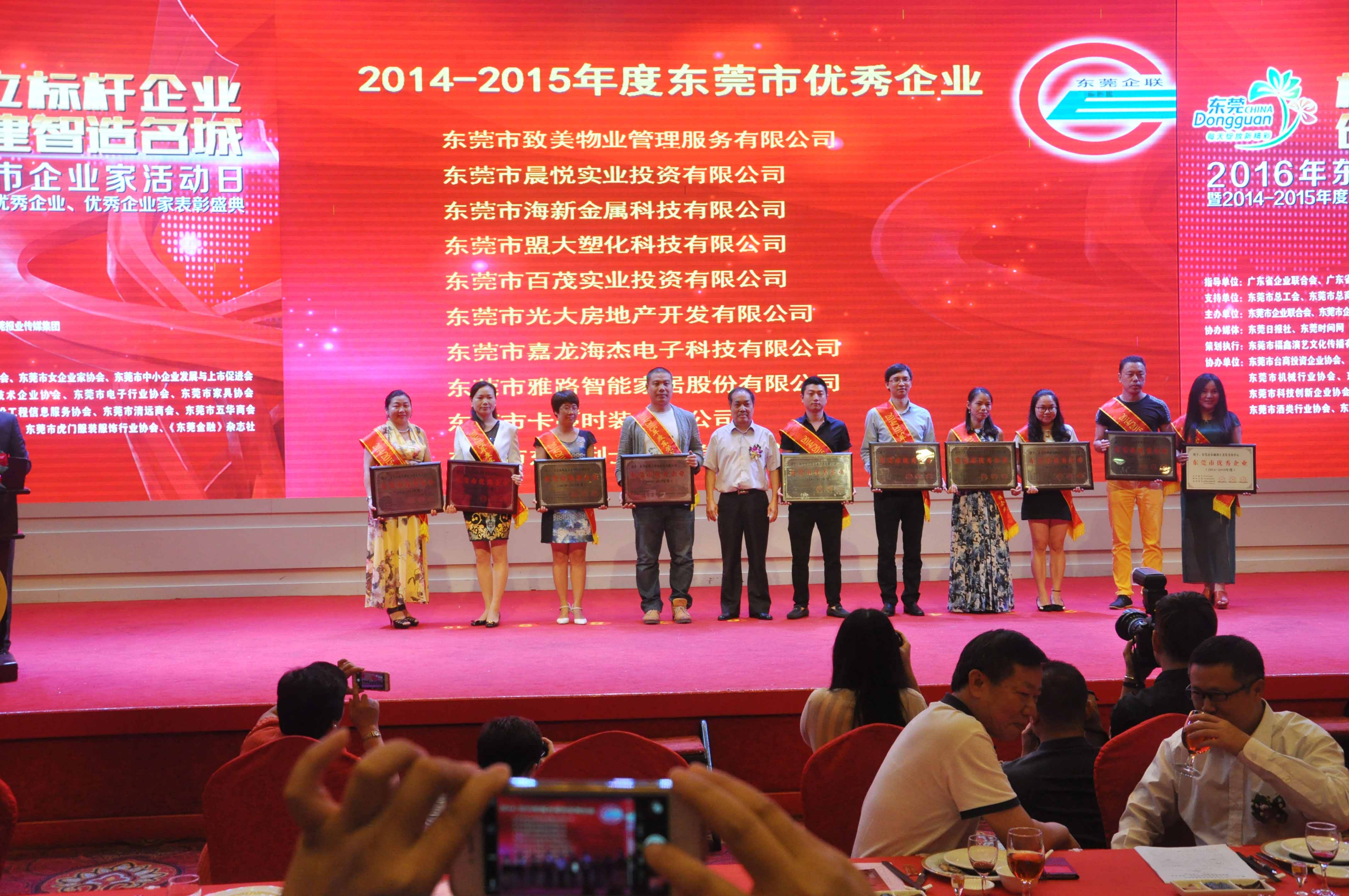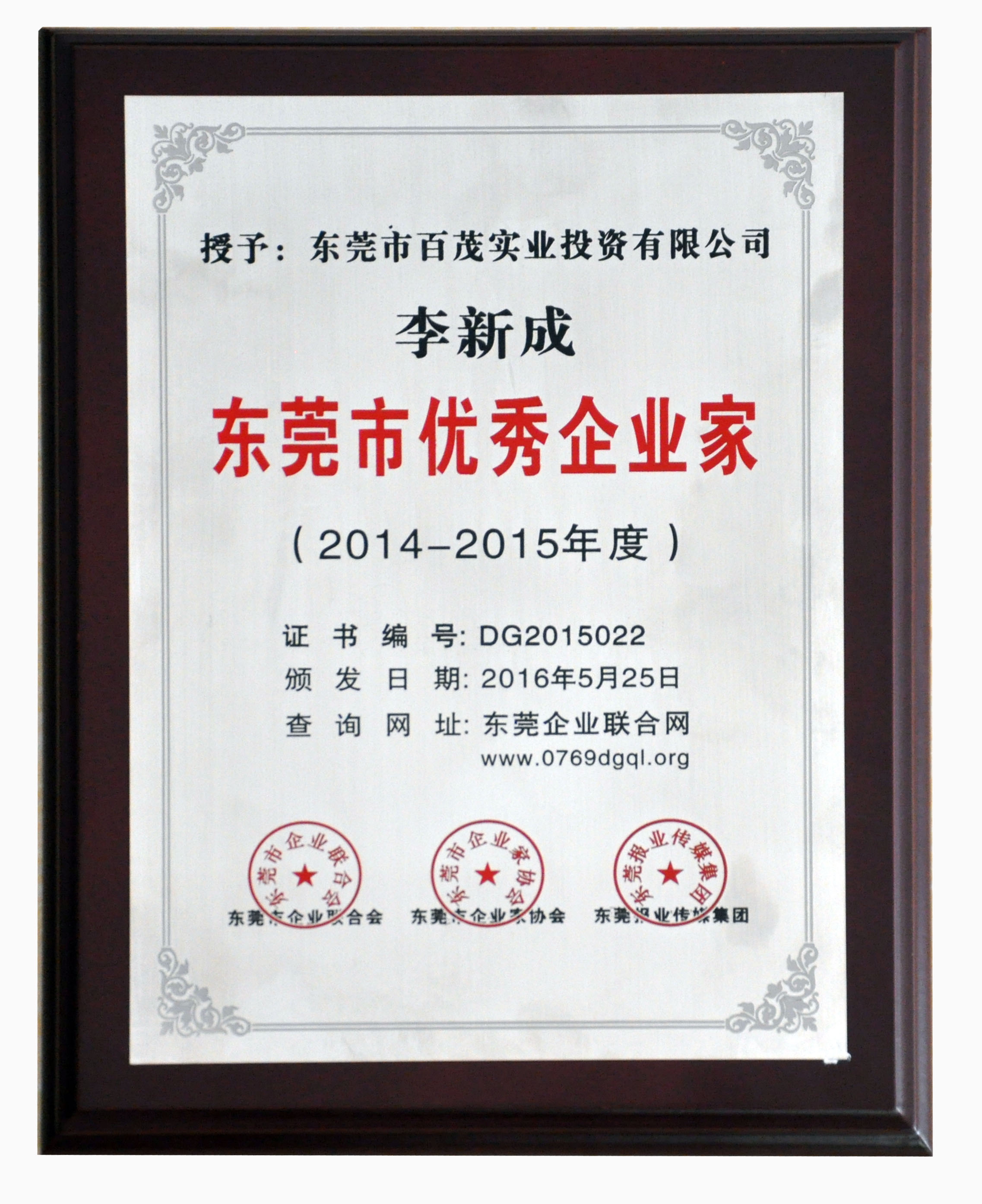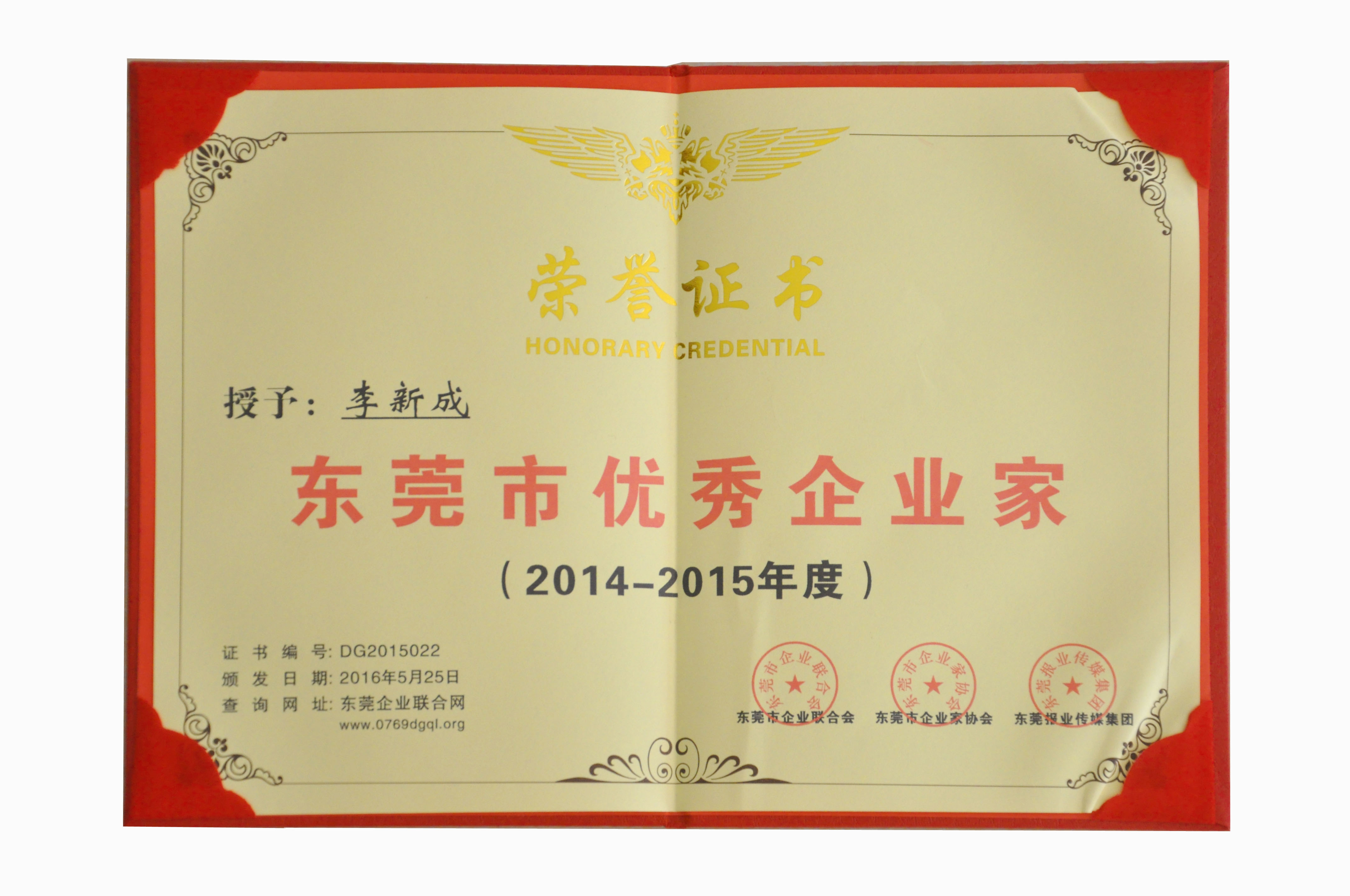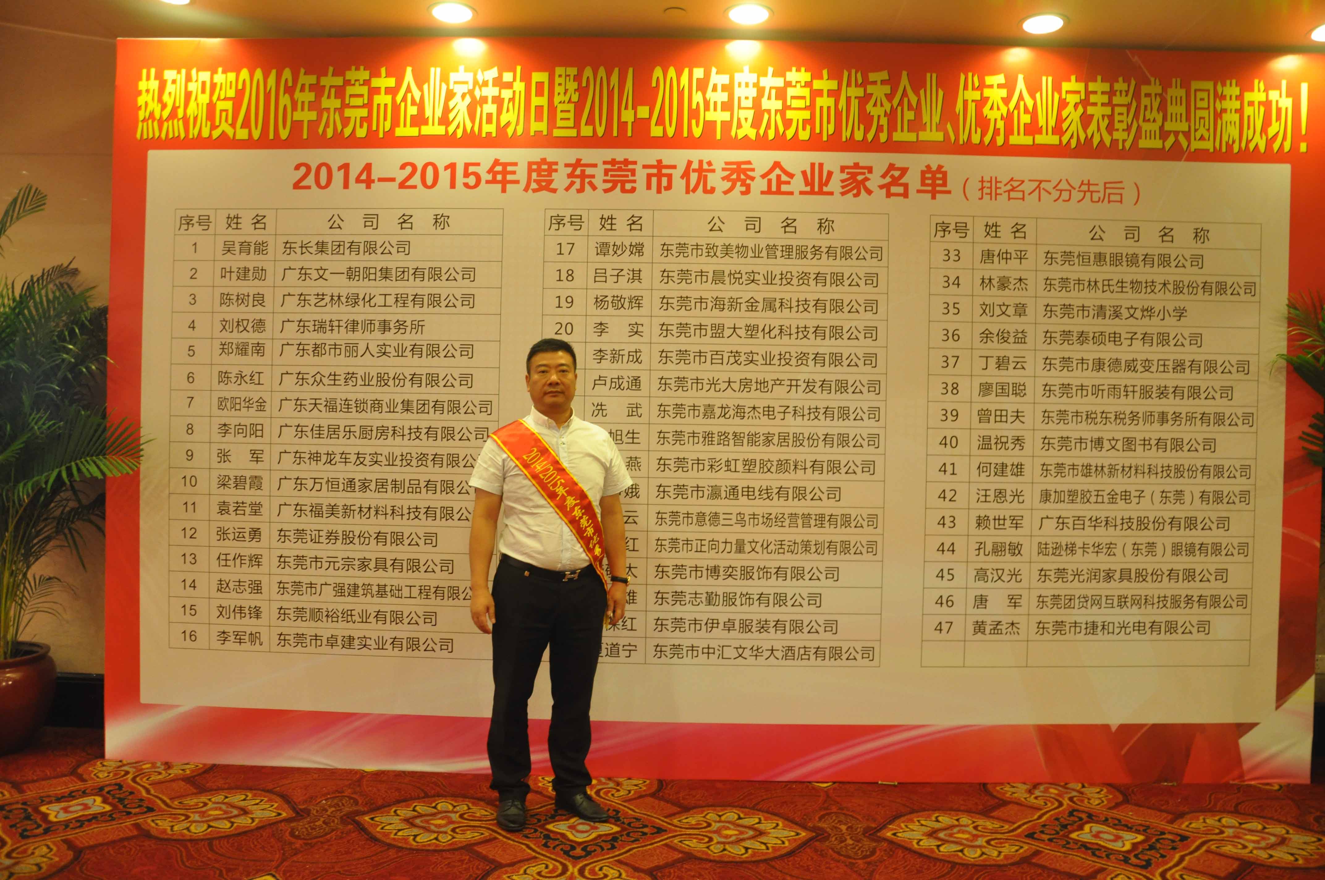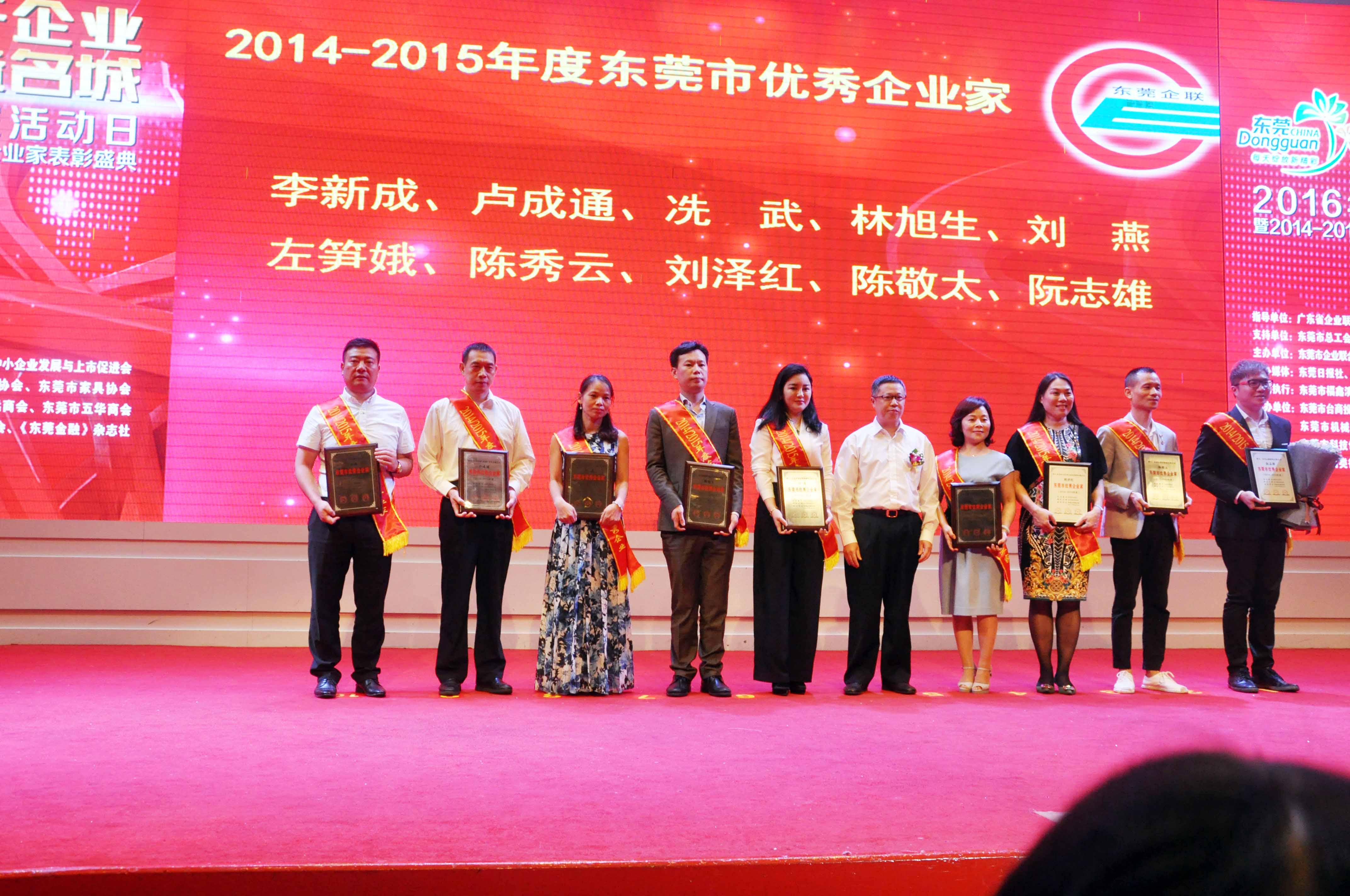 圖為李新成董事長上臺領(lǐng)取“東莞市優(yōu)秀企業(yè)家”獎牌