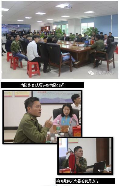 演練前,消防教官在百茂會議室給園區(qū)講解消防安全知識,易燃易爆品的安全防范等相關知識,并結合最近兩家物流園發(fā)生爆炸和火災的相關視頻進行進一步講解。