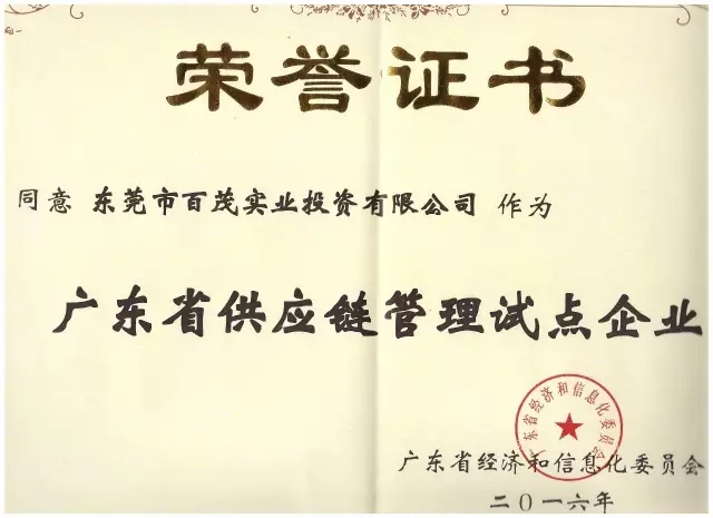 近期,第八屆廣東設(shè)計周暨首屆廣東生產(chǎn)服務(wù)周在廣州開幕?;顒又姓匍_了供應(yīng)鏈管理峰會,峰會期間全省133家供應(yīng)鏈試點企業(yè)獲頒供應(yīng)鏈管理試點資格證書。百茂作為入選的東莞市2家供應(yīng)鏈企業(yè)之一獲得試點資格證書。