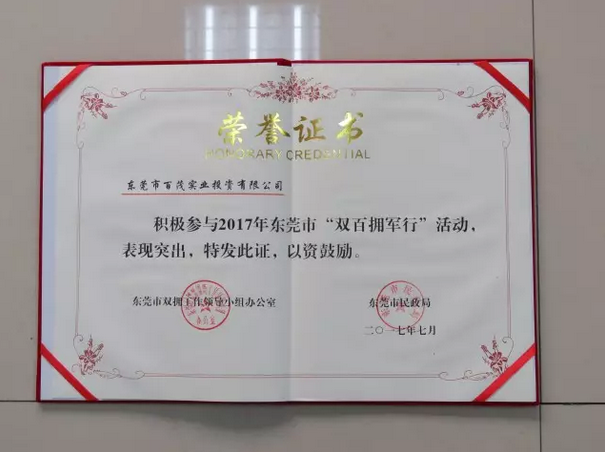 7月11日,在八一建軍節(jié)即將到來(lái)之際,東莞市舉行2017年“雙百擁軍行”活動(dòng)授旗儀式,組織9個(gè)社會(huì)組織和企事業(yè)單位擁軍團(tuán)分赴駐莞部隊(duì)慰問(wèn)基層官兵,掀起社會(huì)化擁軍新熱潮。 東莞市政府調(diào)研員梁紹光,東莞市雙擁辦、東莞市民政局有關(guān)領(lǐng)導(dǎo),以及擁軍團(tuán)代表和駐莞部隊(duì)官兵共200多人參加了儀式,東莞市雙擁辦專職副主任卓軍主持儀式。百茂物流城積極參與此次“雙百擁軍行”活動(dòng),并榮獲了證書。