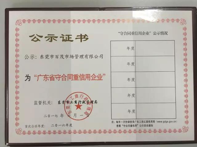 百茂市場管理有限公司獲“廣東省守合同重信用企業(yè)”稱號