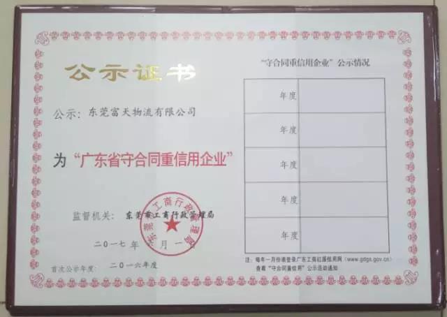 東莞市富天物流有限公司獲“廣東省守合同重信用企業(yè)”稱號