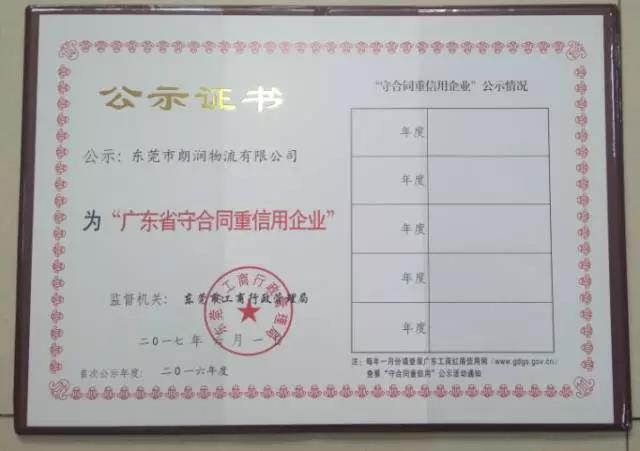 東莞市朗潤物流有限公司獲“廣東省守合同重信用企業(yè)”稱號
