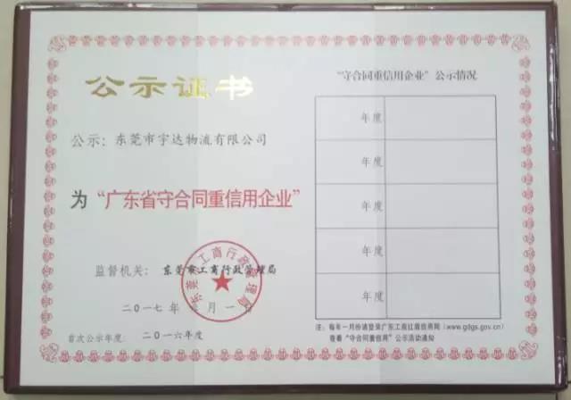 東莞市宇達物流有限公司獲“廣東省守合同重信用企業(yè)”稱號