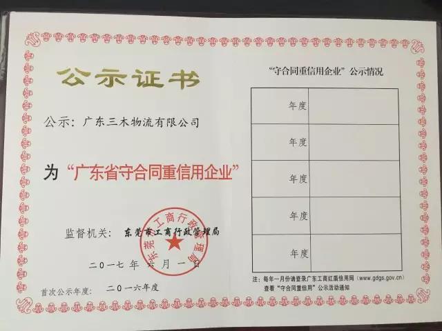 廣東三木物流有限公司獲“廣東省守合同重信用企業(yè)”稱號